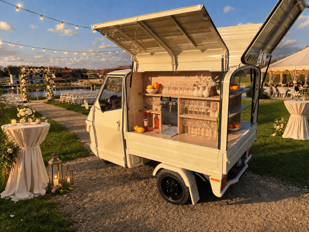 Mit unserem charmanten Piaggio Ape bringen wir italienisches Lebensgefühl, prickelnde Drinks und gute Laune direkt zu dir und deinen Gästen.